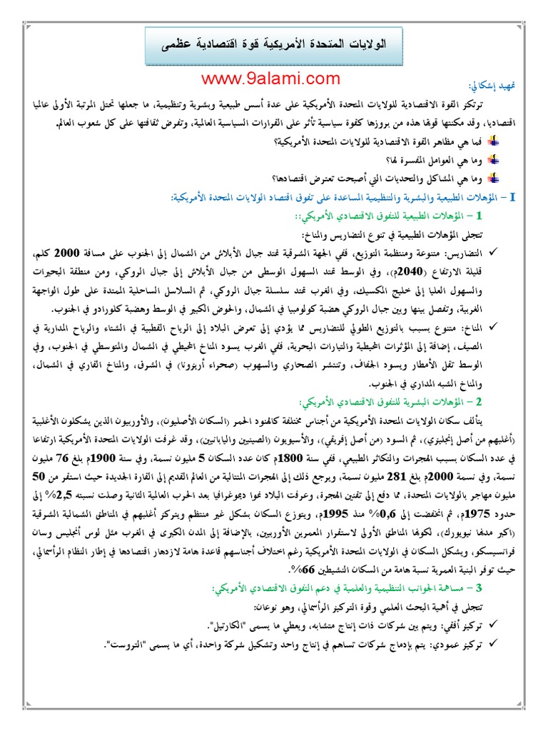 درس الولايات المتحدة الأمريكية قوة اقتصادية عظمى Pdf